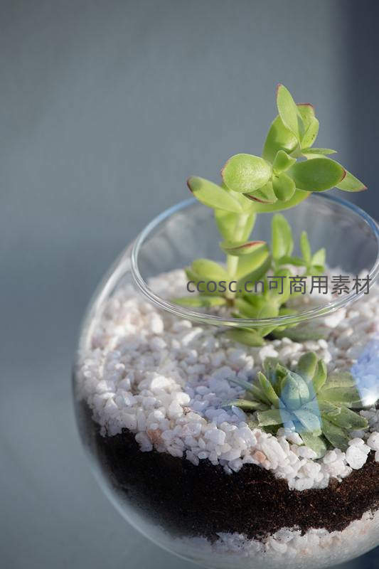 透明玻璃瓶内精心布置了多肉植物与分层土壤、白色石子,构成一个迷你的生态景观,适合桌面摆放。