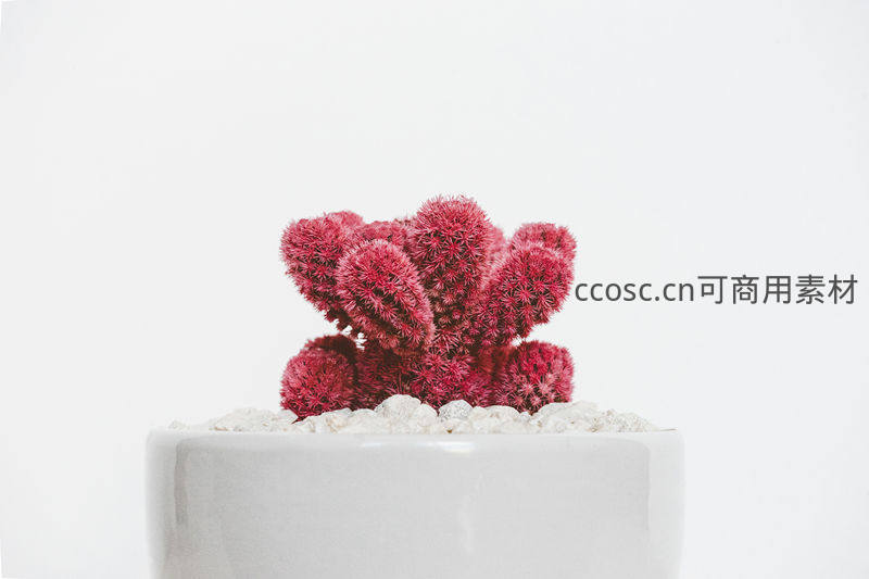 一株鲜艳的红色绒球仙人掌,置于洁白的陶瓷盆中,背景纯净,展现其独特的纹理与色彩,适合作为现代家居装饰。