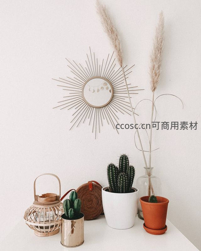 白色桌面上摆放着不同造型的仙人掌盆栽、藤编灯笼和太阳镜装饰,搭配干芦苇,营造出温馨自然的北欧家居氛围。