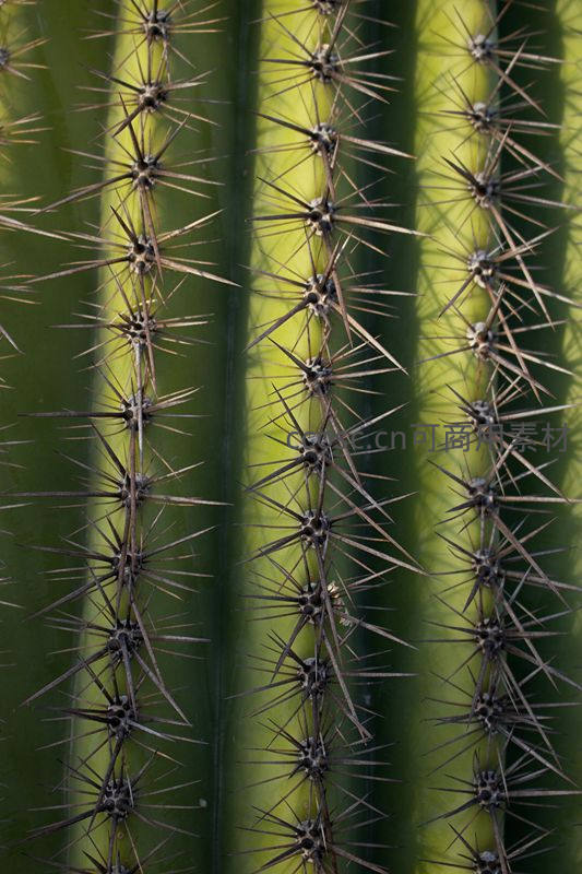 微距镜头下,仙人掌茎干上排列整齐的尖刺在阳光下形成强烈的几何图案,展现植物坚韧的生命力与自然造物的精妙设计。