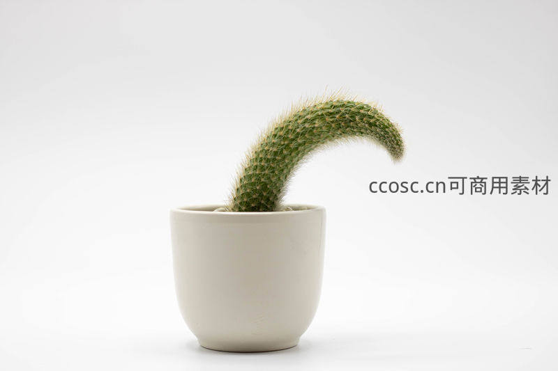 一株造型独特的弯月形仙人掌置于纯白陶瓷盆中,简洁的背景凸显其自然曲线与柔软绒毛,是极简主义风格的理想室内装饰品。