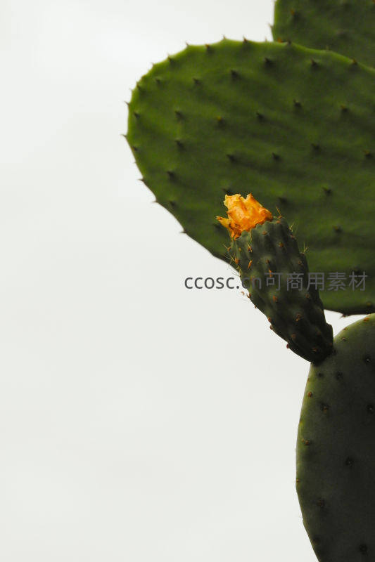 在宽大的仙人掌叶片边缘,一朵娇嫩的橙色小花悄然绽放,与深绿的肉质茎片形成鲜明对比,传递出荒漠植物顽强而温柔的生命之美。