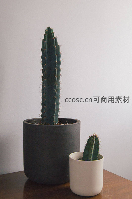两株形态各异的仙人掌,一高一矮,分别置于深灰与米白花盆中,摆放在木质桌面上,背景为纯白墙面,营造出宁静简约的居家氛围。