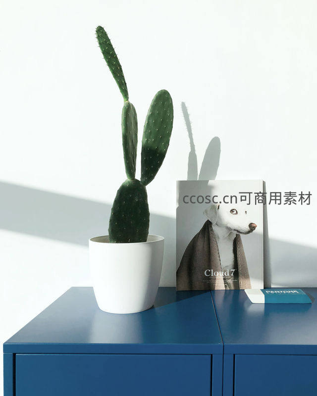 蓝色柜上仙人掌与画册