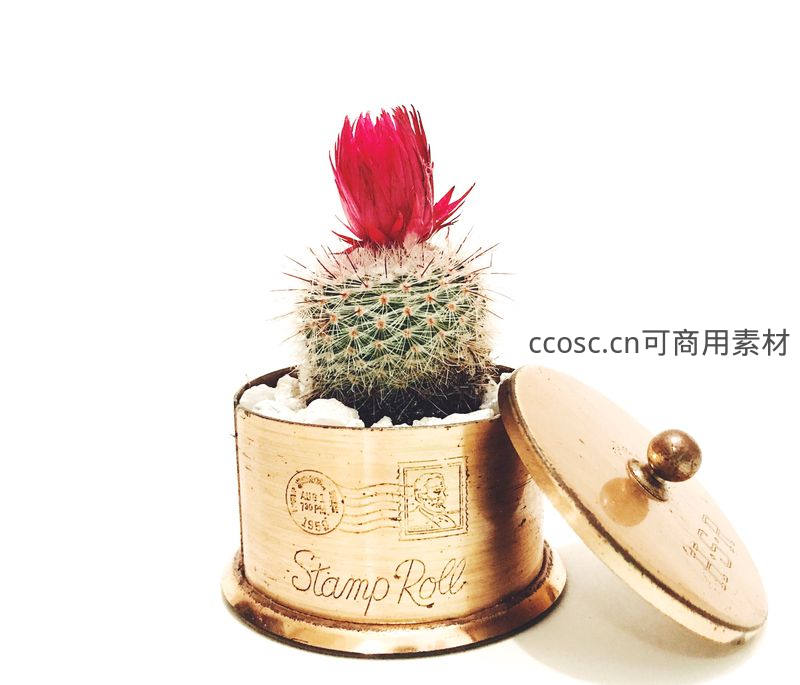 一株顶着鲜艳红花的仙人掌被精心栽种在复古风格的金属邮筒中,白色背景衬托出其独特的艺术美感与生命力。