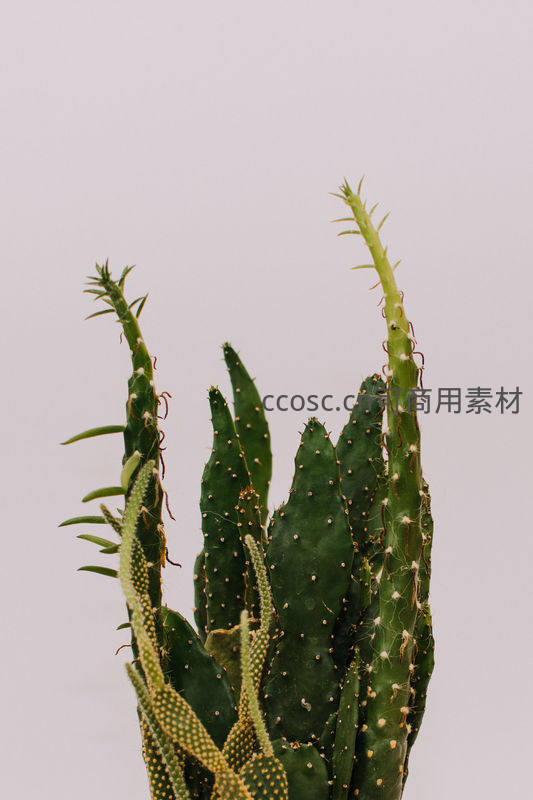 几根向上生长的仙人掌枝条布满细密尖刺,深绿色的表皮与新生嫩芽形成对比,展现其顽强生命力与独特形态。