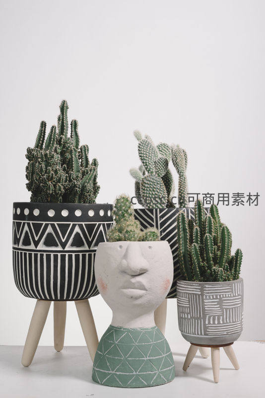 一组造型独特的仙人掌盆栽,其中一盆为白色人脸造型花盆,搭配几何图案的黑白灰花盆,整体风格现代简约,充满艺术感。