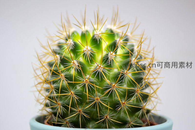 通过微距镜头捕捉到一颗圆润仙人掌的精细结构,其表面布满金黄色的尖刺,在柔和光线下呈现出生机勃勃的绿色与质感对比。