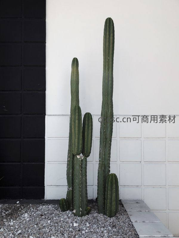 几株高矮不一的柱状仙人掌种植在黑白瓷砖墙角,搭配碎石地面,形成强烈的几何感与色彩对比,展现现代庭院中的自然生命力。
