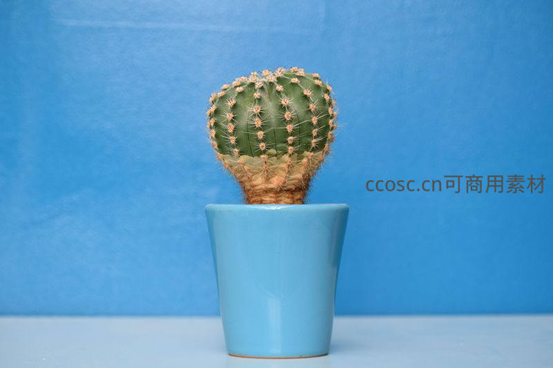 一颗饱满的绿色仙人掌置于天蓝色花盆中,背景纯净,凸显其可爱形态与宁静美感。