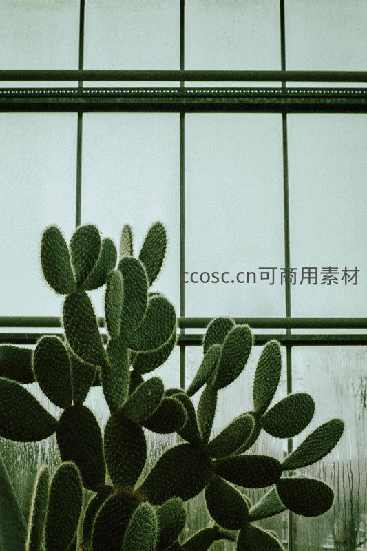 透过温室的格状玻璃窗,一株覆盖着柔软绒毛的仙人掌在柔和的光线下显得格外温柔,模糊的背景增添了画面的诗意与宁静。