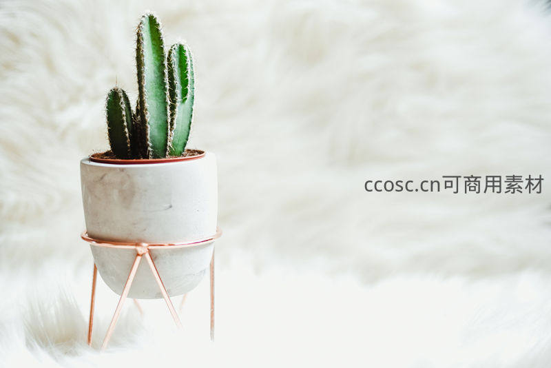 一株小巧的仙人掌置于白色大理石纹理花盆中,搭配铜色支架与柔软白绒背景,营造出温馨雅致的居家氛围。
