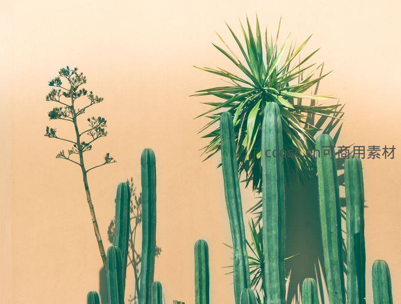 多种形态的仙人掌与龙舌兰在浅色墙面背景下形成鲜明对比,光影交错,营造出清新而富有设计感的视觉效果。
