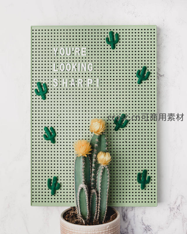 绿色穿孔板上点缀着小仙人掌图案和俏皮文字,搭配真实开花的仙人掌盆栽,打造现代简约又充满趣味的居家装饰。