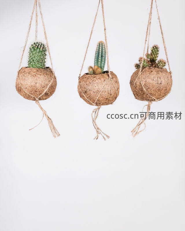 三只椰壳吊篮仙人掌,简约自然风装饰