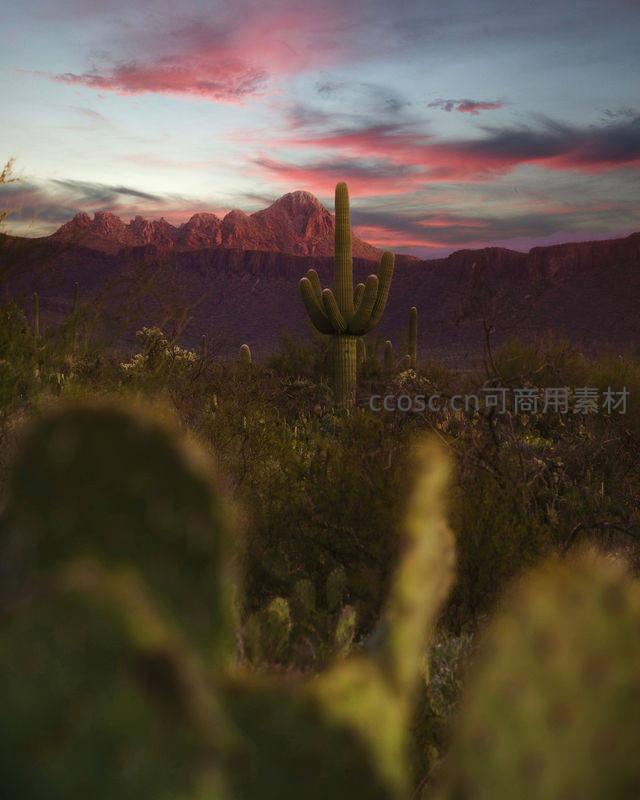 夕阳西下,天空被染成绚烂的粉红色,一座孤傲的仙人掌伫立在荒漠之中,远处山脉轮廓清晰,构成一幅宁静而壮美的自然画卷。
