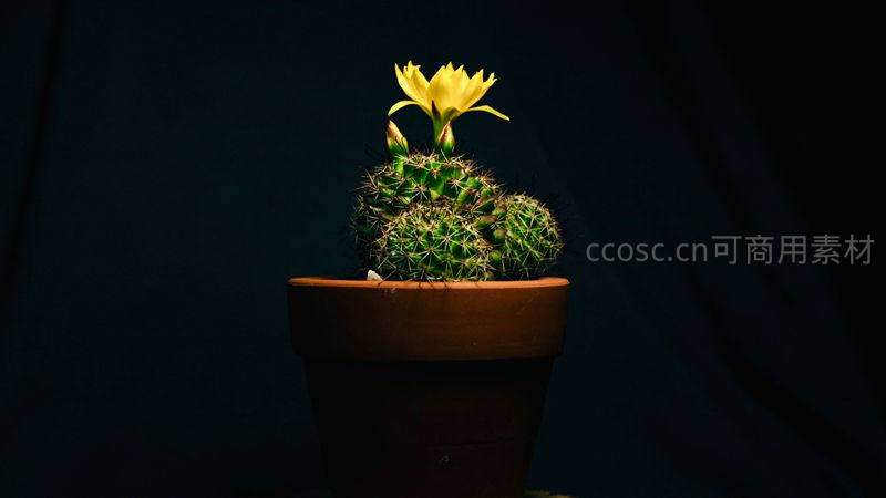 一株小巧的仙人球在深色背景下盛开出娇嫩的黄色花朵,光影对比突出其精致形态,营造宁静优雅氛围。