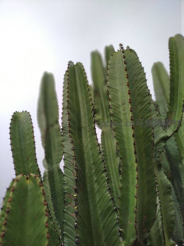 近距离拍摄高大仙人掌的茎干细节,清晰展现其表面排列整齐的尖刺与翠绿的色泽,在柔和光线下呈现出生命力与自然之美。