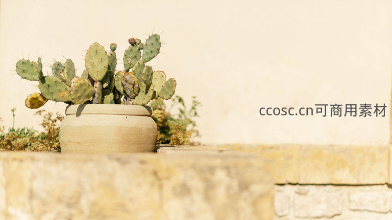 一个粗陶花盆盛放着形态自然的仙人掌,安放在温暖阳光下的石砌矮墙上,背景是米色墙面,整体画面宁静、质朴且富有度假风情。