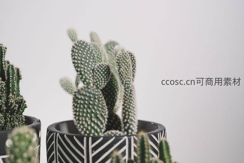 一株毛茸茸的仙人掌被种植在带有黑白几何图案的现代风格花盆中,简洁的背景突显其清新可爱的造型,是现代家居的理想装饰品。