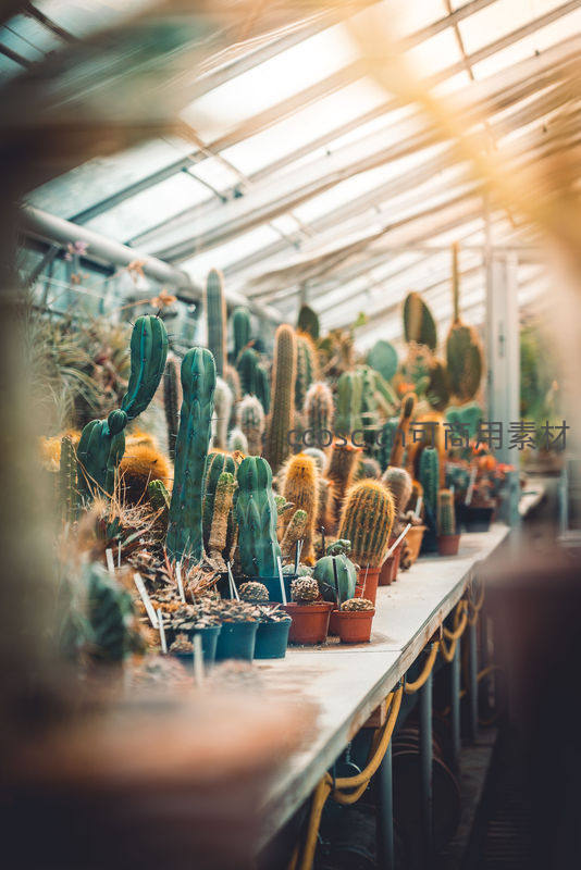 透过模糊前景,温室内的长桌上整齐陈列着各式各样的仙人掌与多肉植物,在温暖阳光的照射下,充满生机与治愈感。