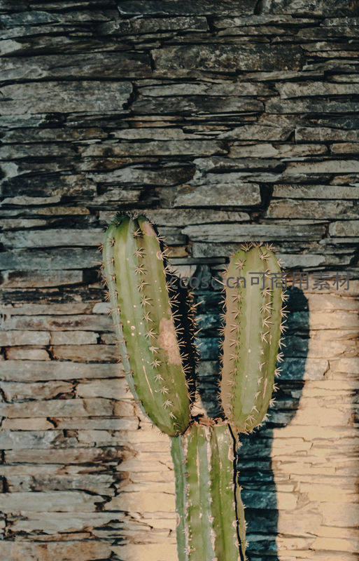 在粗糙石墙的映衬下,两支翠绿的仙人掌柱体挺立,其上的尖刺在光线下清晰可见,投射出深邃的阴影,展现了植物的坚韧与质感。