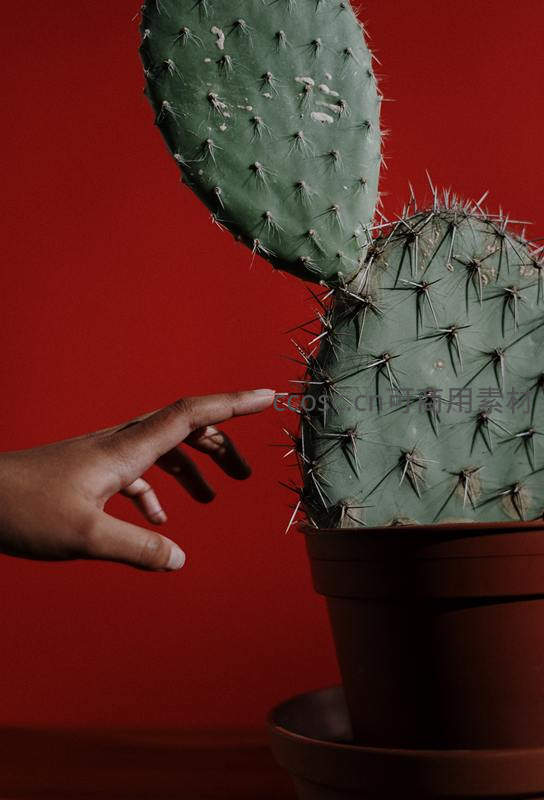 在鲜艳的红色背景下,一只手指小心翼翼地伸向一株布满尖刺的仙人掌,营造出紧张又充满艺术感的视觉张力,探讨人与自然的边界。