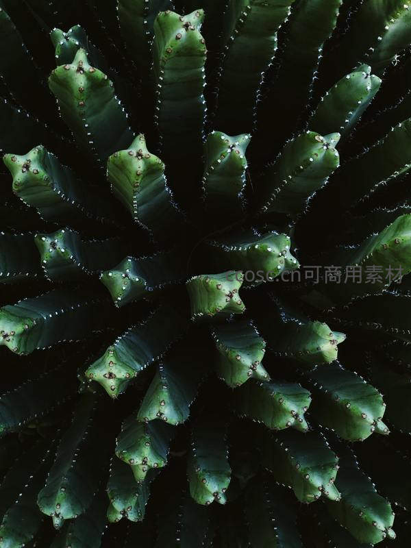 在近乎全黑的背景下,一株多肉植物的叶片以放射状紧密排列,其深绿色的表面和清晰的棱角线条展现出强烈的几何美感和自然的纹理细节。