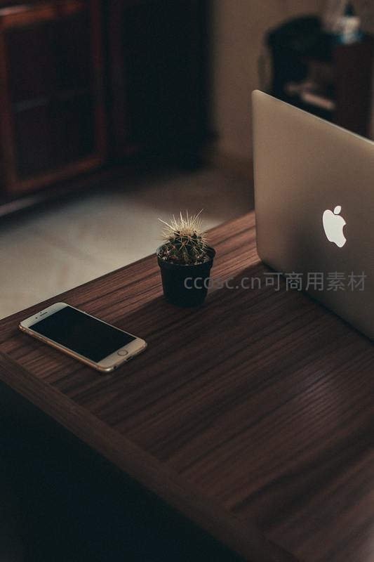 一张深色木质书桌上,一台打开的苹果笔记本电脑旁放着一部智能手机,中间点缀着一盆小巧的仙人掌,营造出温馨、实用且富有生活气息的现代办公角落。