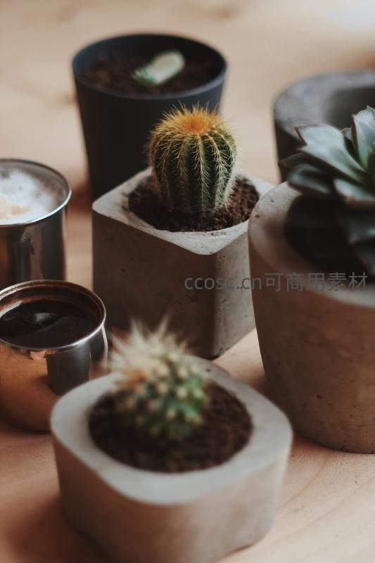 多肉组合:水泥盆中的仙人掌与咖啡时光