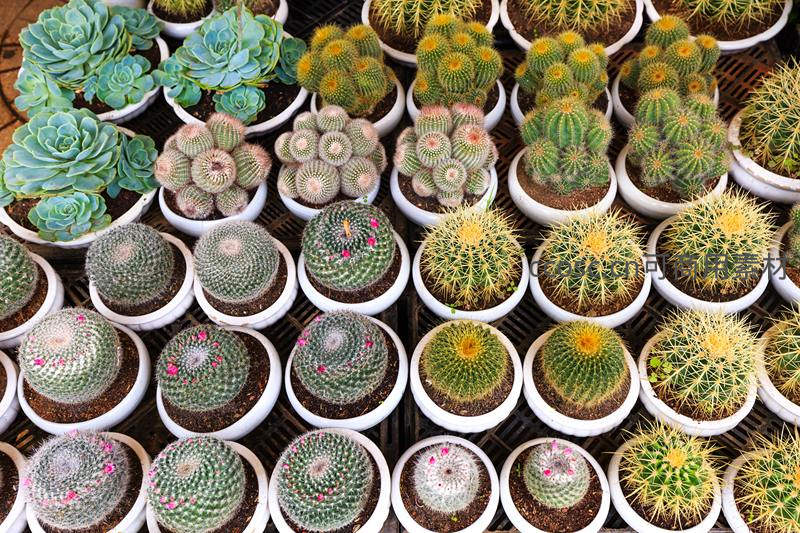整齐排列的各色仙人掌与多肉植物,盛放在白色小盆中,部分绽放粉色小花,充满生机与装饰美感。
