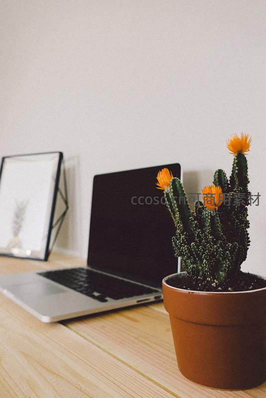 一盆盛开橙色花朵的仙人掌静置于木质办公桌上,旁有笔记本电脑和相框,营造温馨专注的工作氛围。