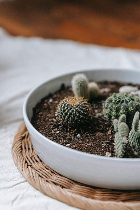 小巧的仙人掌组合种植于白色陶瓷盆中,置于藤编垫上,搭配柔和光线,营造温馨舒适的居家绿意氛围。