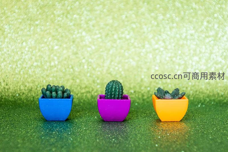 三个色彩鲜艳的方形小花盆(蓝、紫、橙)整齐排列,分别栽种着不同形态的迷你多肉植物,背景是梦幻的渐变闪光绿,整体画面充满童趣与活力。