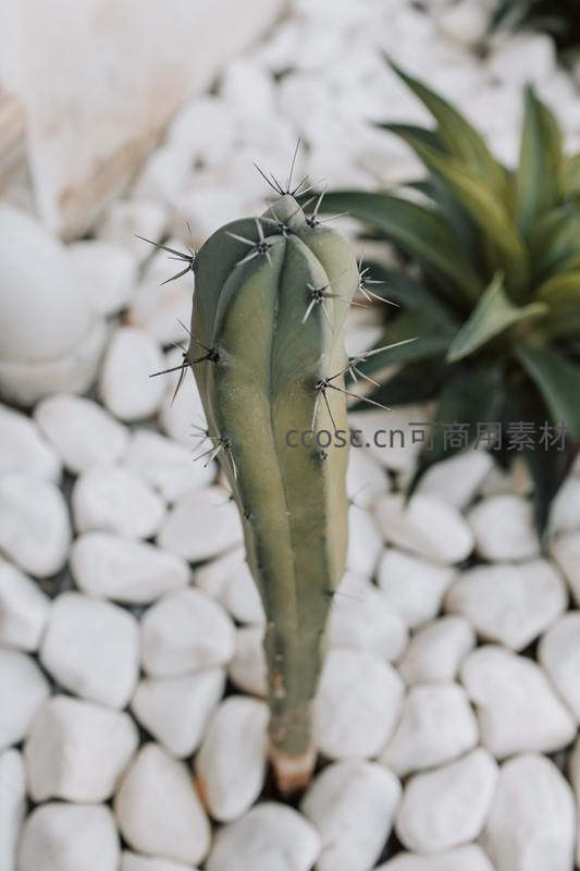 镜头聚焦于一株生长在洁白鹅卵石间的仙人掌,其尖锐的刺与柔润的石子形成对比,展现自然中的坚韧与美感。