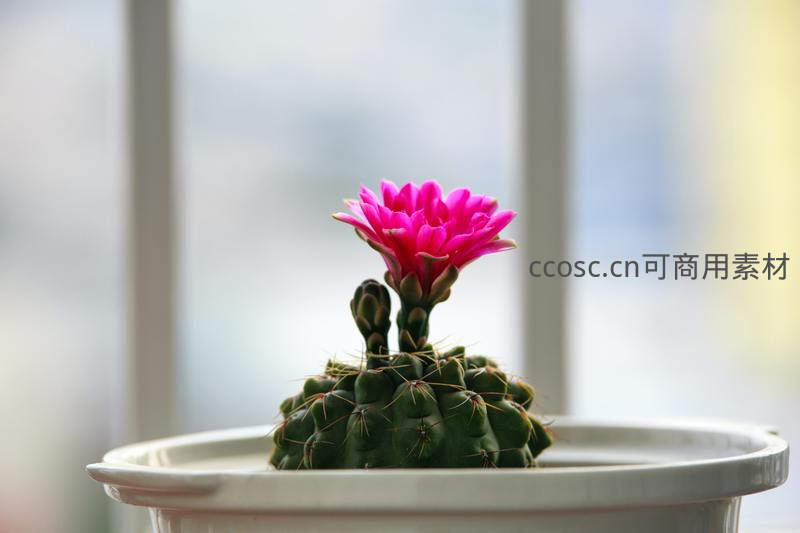 一株圆润的仙人掌顶端盛开着一朵娇艳的粉红色花朵,花瓣层层叠叠,在柔和的窗边光线下显得格外动人,展现了生命的奇妙与美丽。