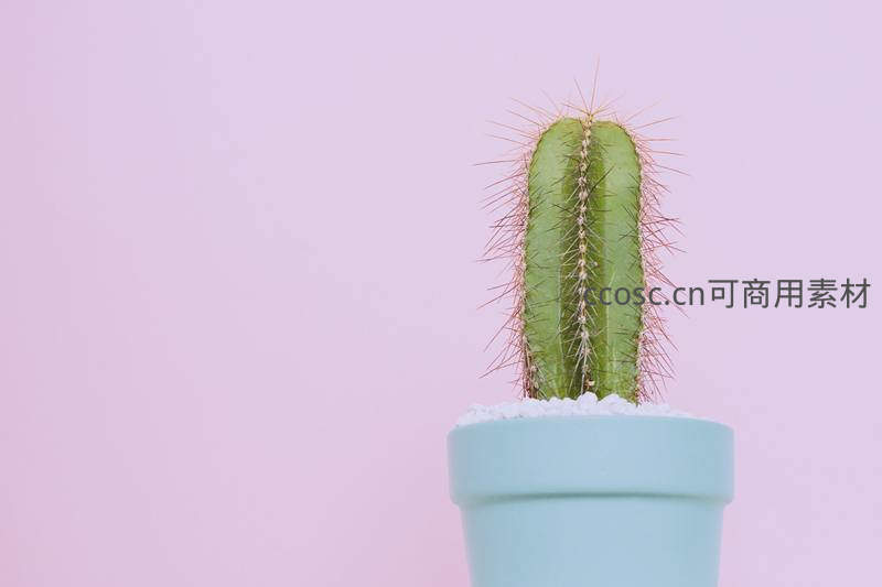 一株形态优美的仙人掌独立置于一个淡蓝色的花盆中,背景是纯净的淡粉色,整体画面简洁明快,充满现代感和设计美学。