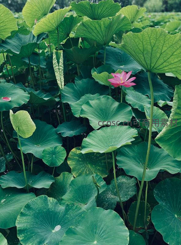 广阔的荷塘里,无数碧绿的荷叶铺展开来,一枝粉红色的荷花在其中悄然绽放,成为视觉的焦点。