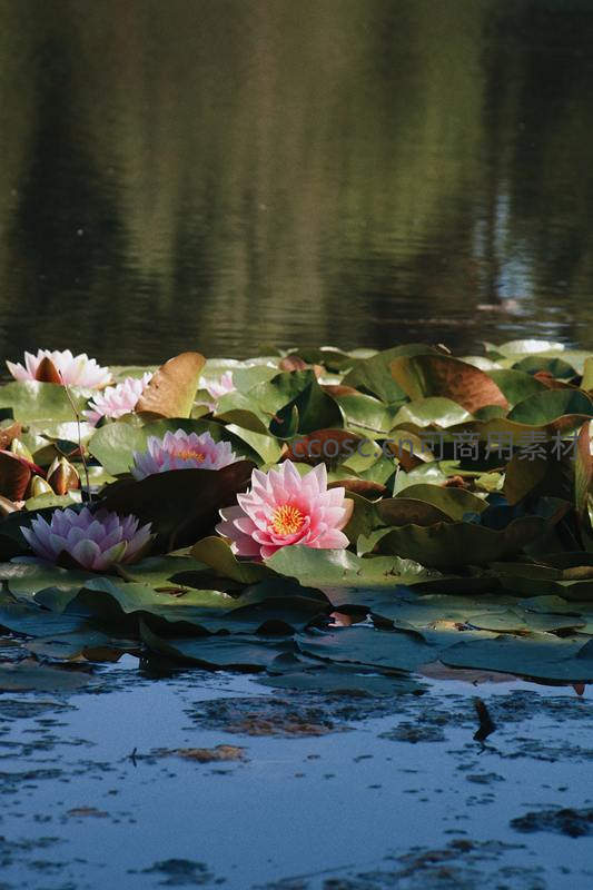 池塘中绽放的粉色睡莲与碧绿荷叶