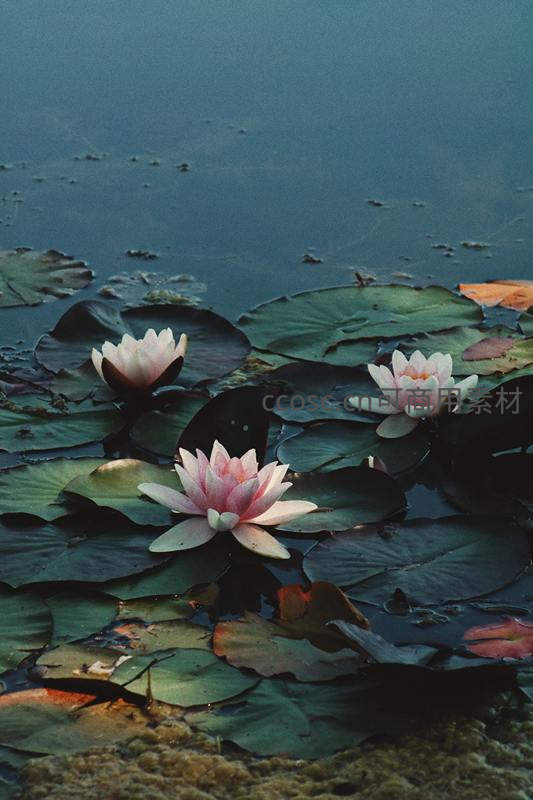 暮色下湖面漂浮的几朵洁白睡莲
