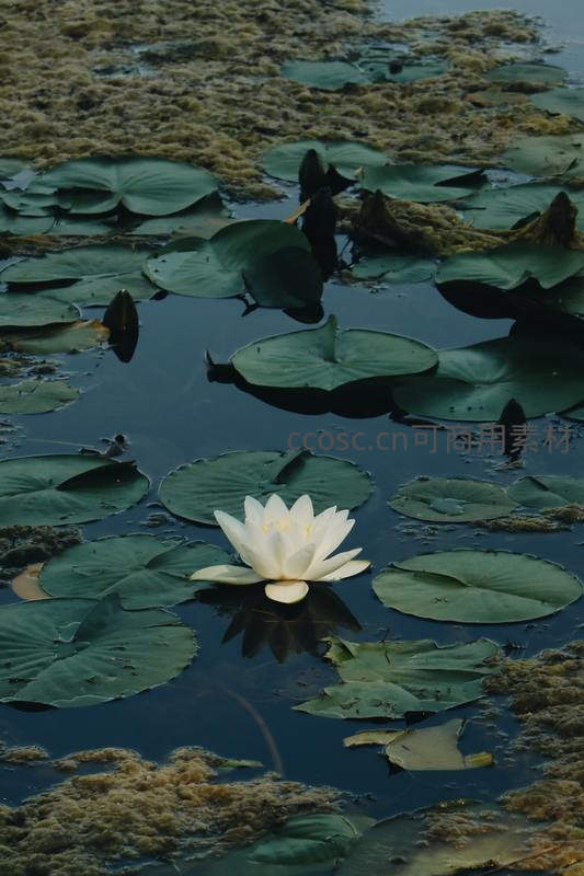 一朵洁白无瑕的睡莲独自盛开在幽暗的深水中央,其完美的倒影清晰可见,周围环绕着深绿的荷叶和浮萍,尽显高洁与宁静。