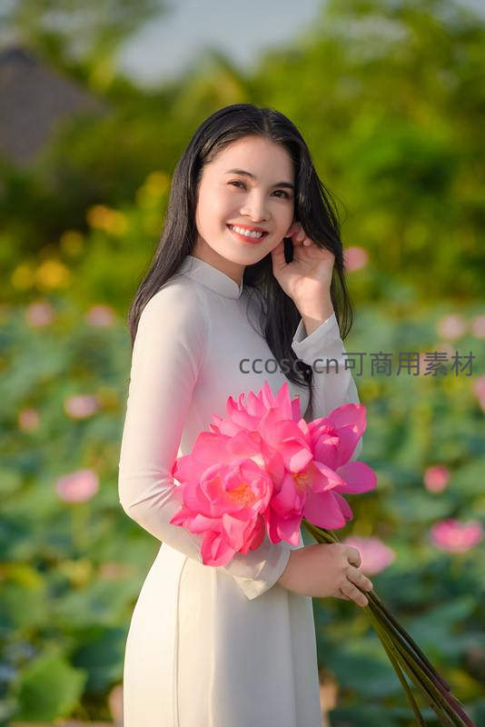 一位身着白色传统长裙的年轻女子,在荷花池边手持一束粉红莲花,面带灿烂微笑,背景是朦胧的绿色与粉色花海。