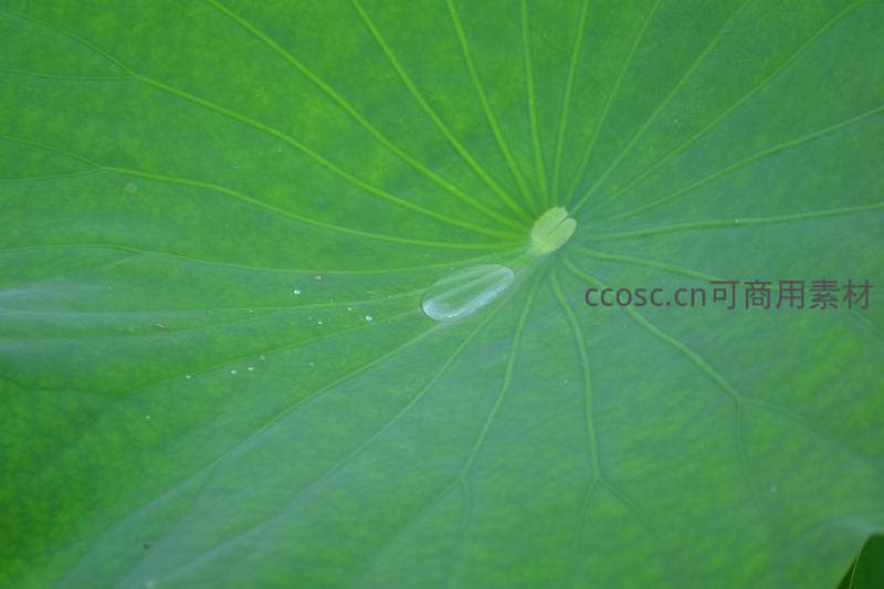 一张荷叶的微距特写,清晰展现其放射状的叶脉纹理,一滴晶莹剔透的水珠静静躺在叶心,绿色的背景充满生机,细节之美令人赞叹。