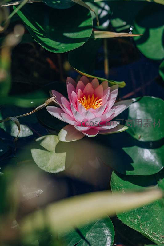 在斑驳的光影下,一朵淡粉色的睡莲静静开放,花瓣柔和,花蕊金黄,周围是深绿的荷叶和幽暗的水面,前景虚化增添了画面的层次感与梦幻氛围。