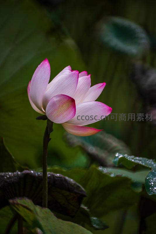 雨后初绽的荷花,粉白花瓣上沾着晶莹水珠,在深绿荷叶的环抱中,散发出清新脱俗的自然之美。