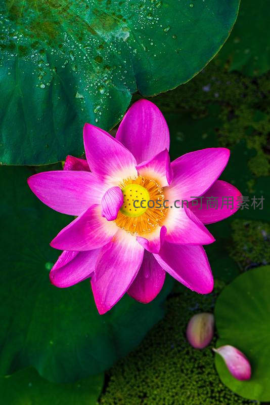 从上方俯瞰一朵完全绽放的粉色荷花,金黄花蕊清晰可见,周围碧绿荷叶与水面浮萍共同构成一幅生动的夏日生态画卷。