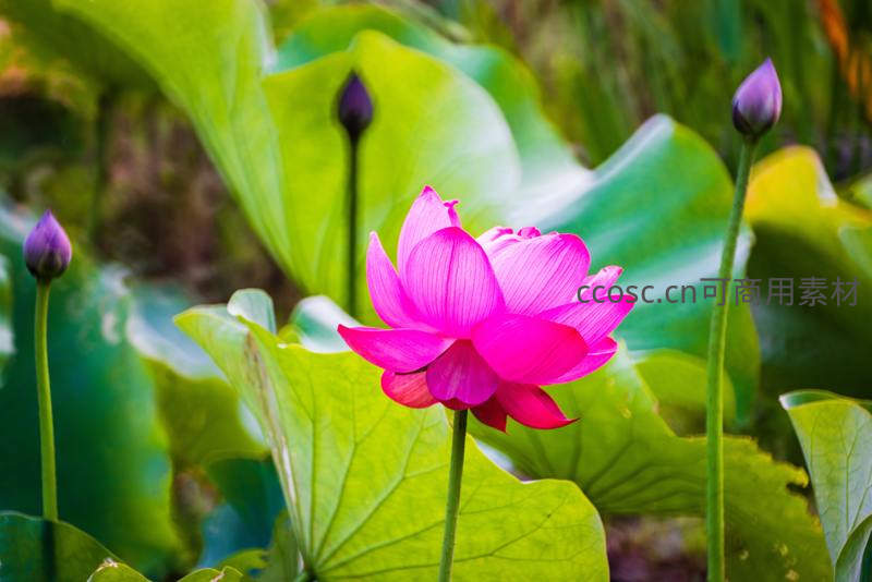 一朵粉红色的莲花正在绽放,旁边还有几个含苞待放的花蕾。大片的绿色荷叶作为背景,营造出充满生机与希望的夏日池塘景象。