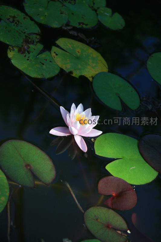 一朵小巧的淡粉色睡莲安静地漂浮在深色水面上,周围是斑驳的绿色荷叶,构成一幅宁静而清新的自然画卷。