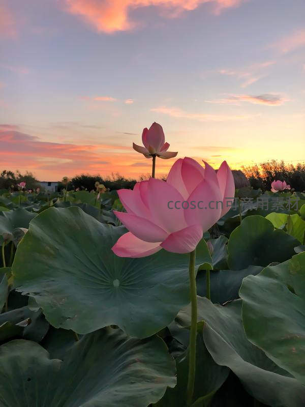 在绚烂的夕阳余晖下,几朵粉色荷花在广阔的荷塘中静静绽放,巨大的荷叶与多彩的天空共同构成诗意的黄昏景象。