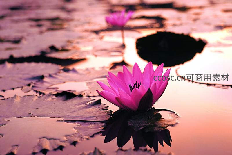 夕阳余晖下,粉莲静卧水面,倒影如画。